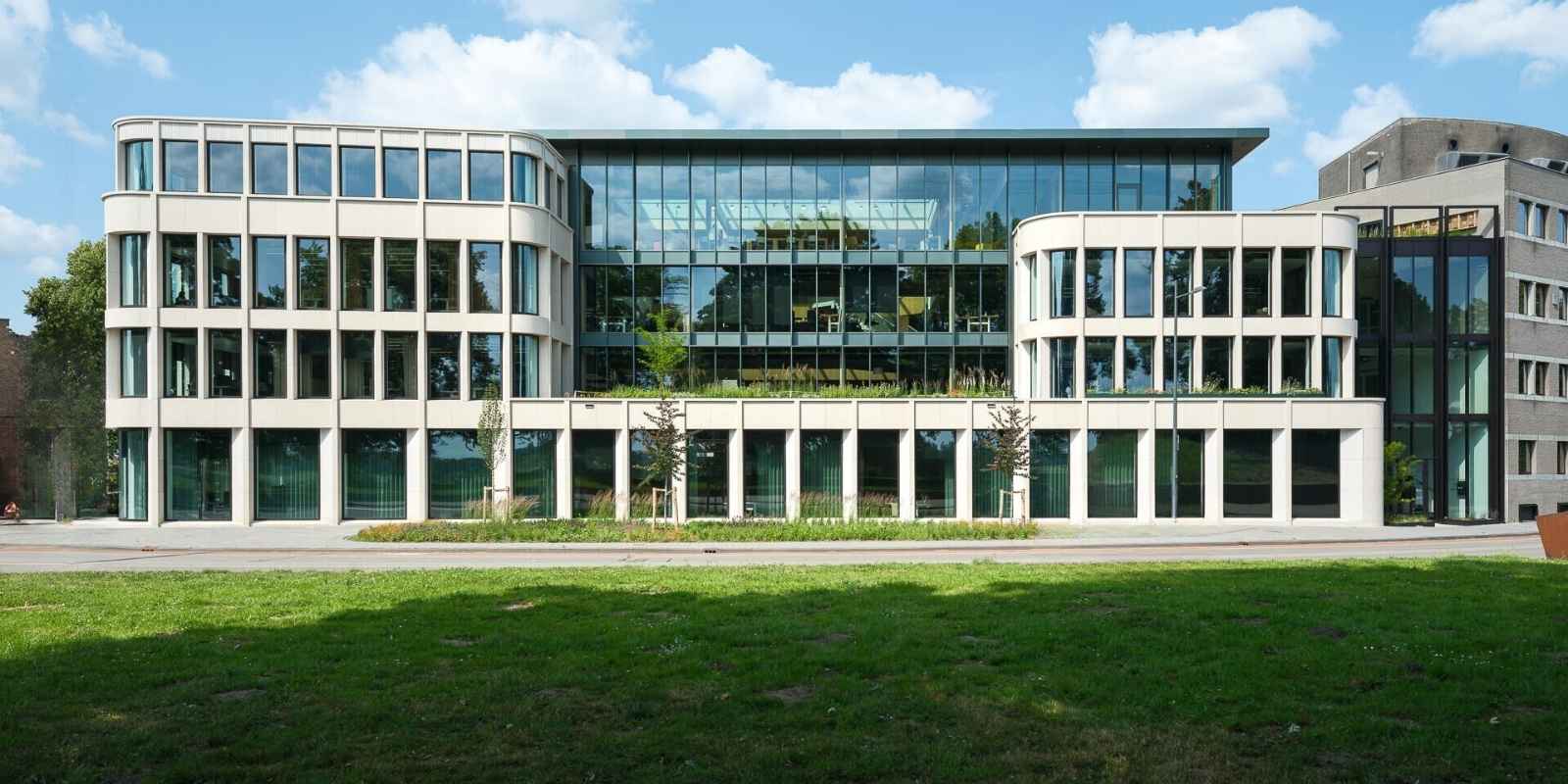 Architectenbureau BiermanHenket en gevelbouwer Facédo Geveltechniek tekenden voor Bastion Zuid in ‘s-Hertogenbosch, een kantoorgebouw dat zich nestelt tussen het Bossche Broek en de monumentale binnenstad. Een centraal atrium zorgt voor daglichttoetreding en visuele verbinding met de omgeving. Aan de straatzijde kreeg het pand witte, gesloten elementen met geledingen en rondingen, terwijl het hogere bouwdeel een groen geanodiseerde vliesgevel laat zien. Gebogen hoeken en hoge kozijnen geven het project een eigentijds karakter zonder de historische context te negeren. Het gebouw illustreert hoe de prijs voor architectonische bouwprojecten ook ruimte biedt aan utilitaire ingrepen op gevoelige locaties.